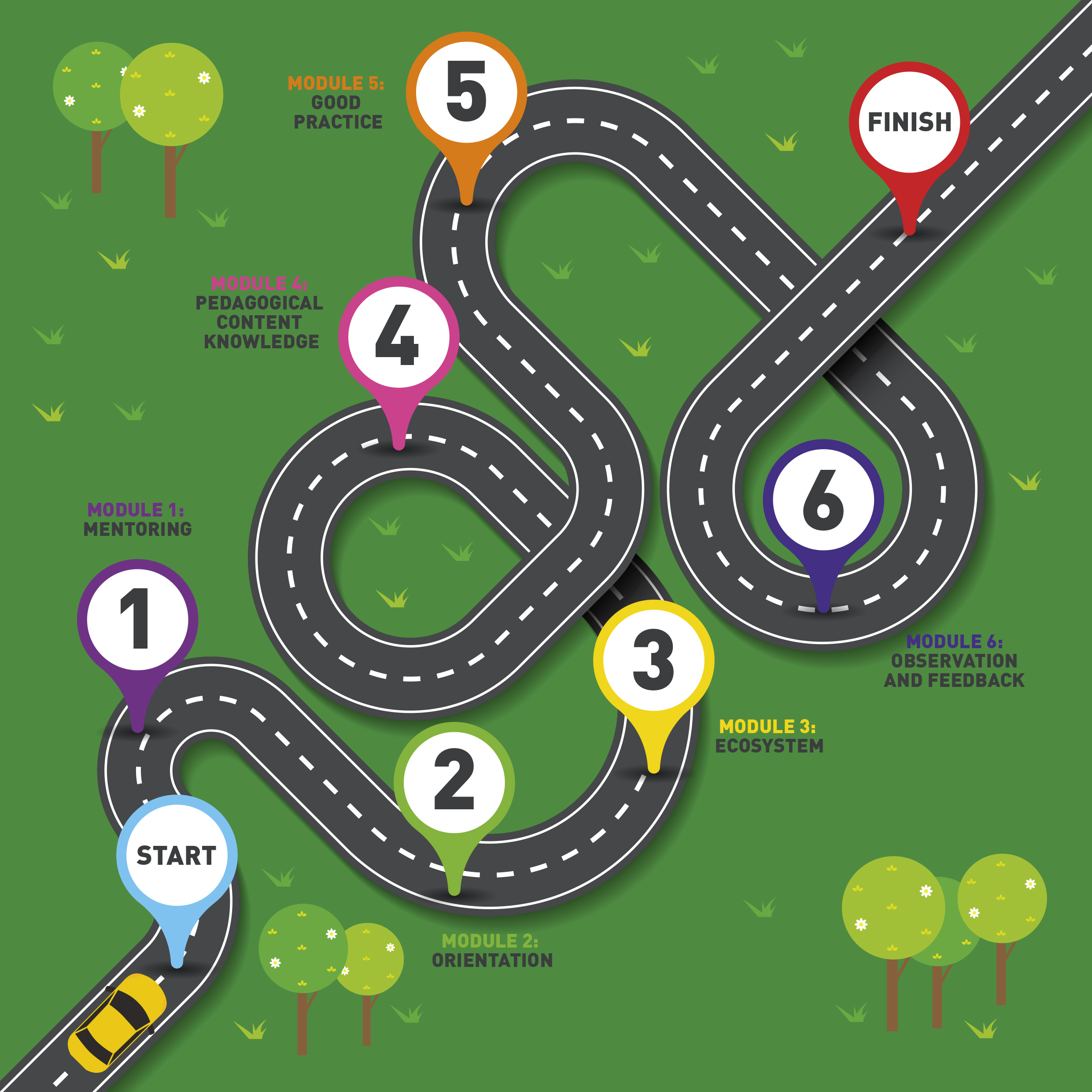 The course is divided into 6 modules (themes), as shown in the roadmap.