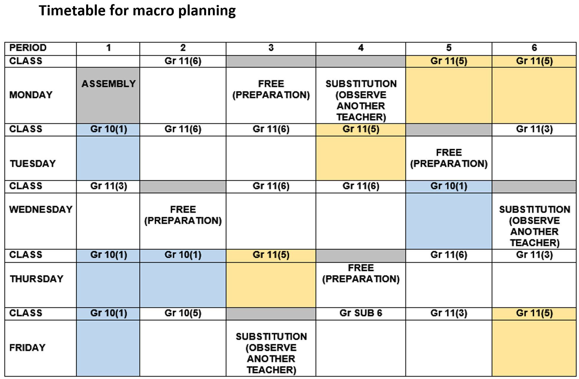 In the visual example below, the student teacher will teach one Grade 11 and one Grade 10 class. The empty blocks can be used for relevant notes on topics, where to pick up in the next lesson, etc.